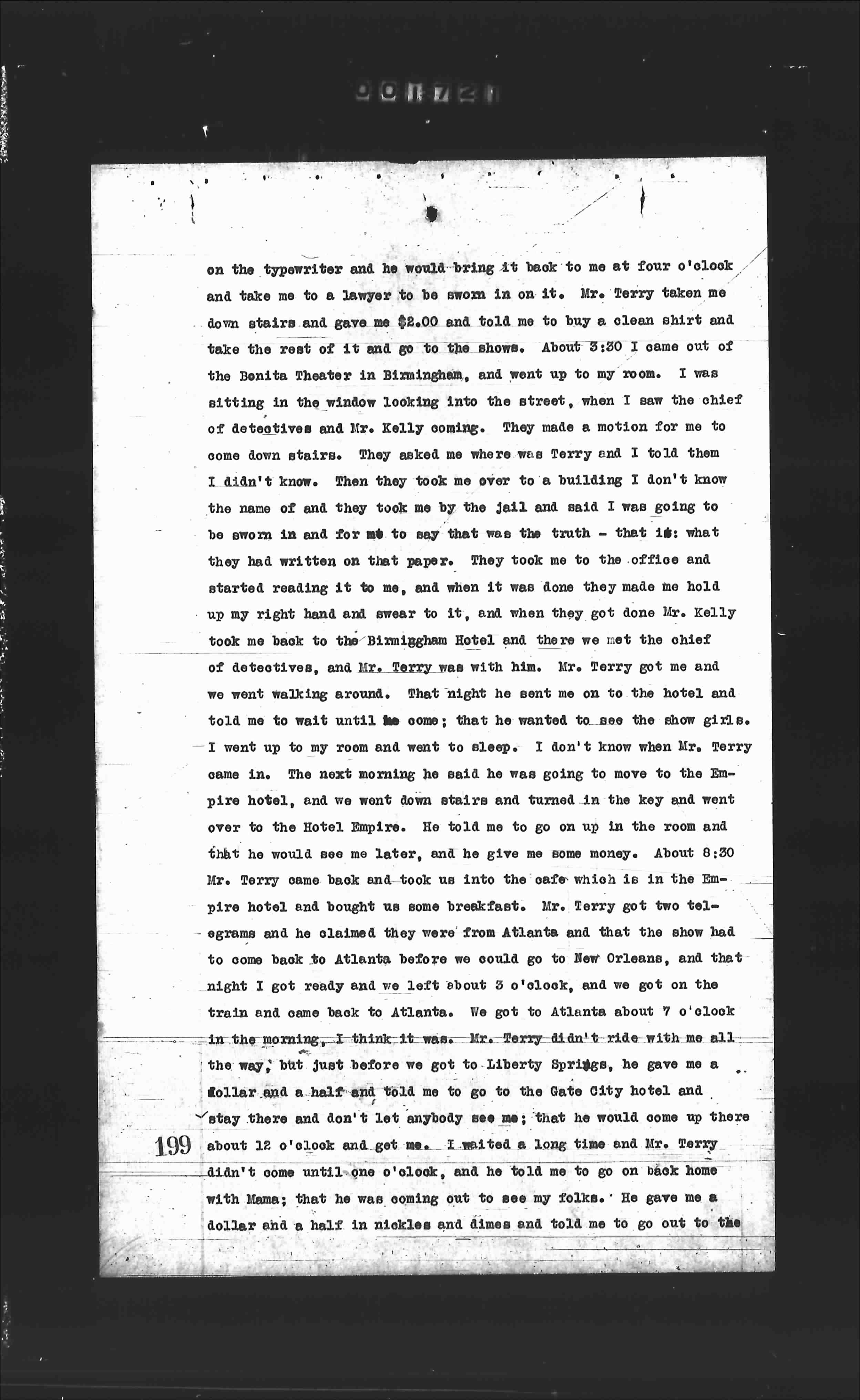 on the typewriter and he would bring it back to me at four o'clock and take me to a lawyer to be sworn in on it. Mr. Terry taken me down stairs and gave me $2.00 and told me to buy a clean shirt and take the rest of it and go to the show. About 5:30 I came out of the Bonita Theater in Birmingham, and went up to my room. I was sitting in the window looking into the street, when I saw the chief of detectives and Mr. Kelly coming. They made a motion for me to come down stairs. They asked me where was Terry and I told them I didn't know. Then they took me over to a building I don't know the name of and they took me by the jail and said I was going to be sworn in and for me to say that was the truth - that is what they had written on that paper. They took me to the office and started reading it to me, and when it was done they made me hold up my right hand and swear to it, and when they got done Mr. Kelly took me back to the Birmingham Hotel and there we met the chief of detectives, and Mr. Terry was with him. Mr. Terry got me and we went walking around. That night he sent me on to the hotel and told me to wait until he come; that he wanted to see the show girls. I went up to my room and went to sleep. I don't know when Mr. Terry came in. The next morning he said he was going to move to the Empire hotel, and we went down stairs and turned in the key and went over to the Hotel Empire. He told me to go on up in the room and that he would see me later, and he gave me some money. About 8:30 Mr. Terry came back and took us into the cafe which is in the Empire hotel and bought us some breakfast. Mr. Terry got two telegrams and he claimed they were from Atlanta and that the show had to come back to Atlanta before we could go to New Orleans, and that night I got ready and we left about 3 o'clock, and we got on the train and came back to Atlanta. We got to Atlanta about 7 o'clock in the morning - I think it was. Mr. Terry didn't ride with me all the way, but just before we got to Liberty Springs, he gave me a dollar and a half and told me to go to the Gate City hotel and stay there and don't let anybody see me; that he would come up there about 12 o'clock and get me. I waited a long time and Mr. Terry didn't come until one o'clock, and he told me to go on back home with mama; that he was coming out to see my folks. He gave me a dollar and a half in nickles and dimes and told me to go out to the