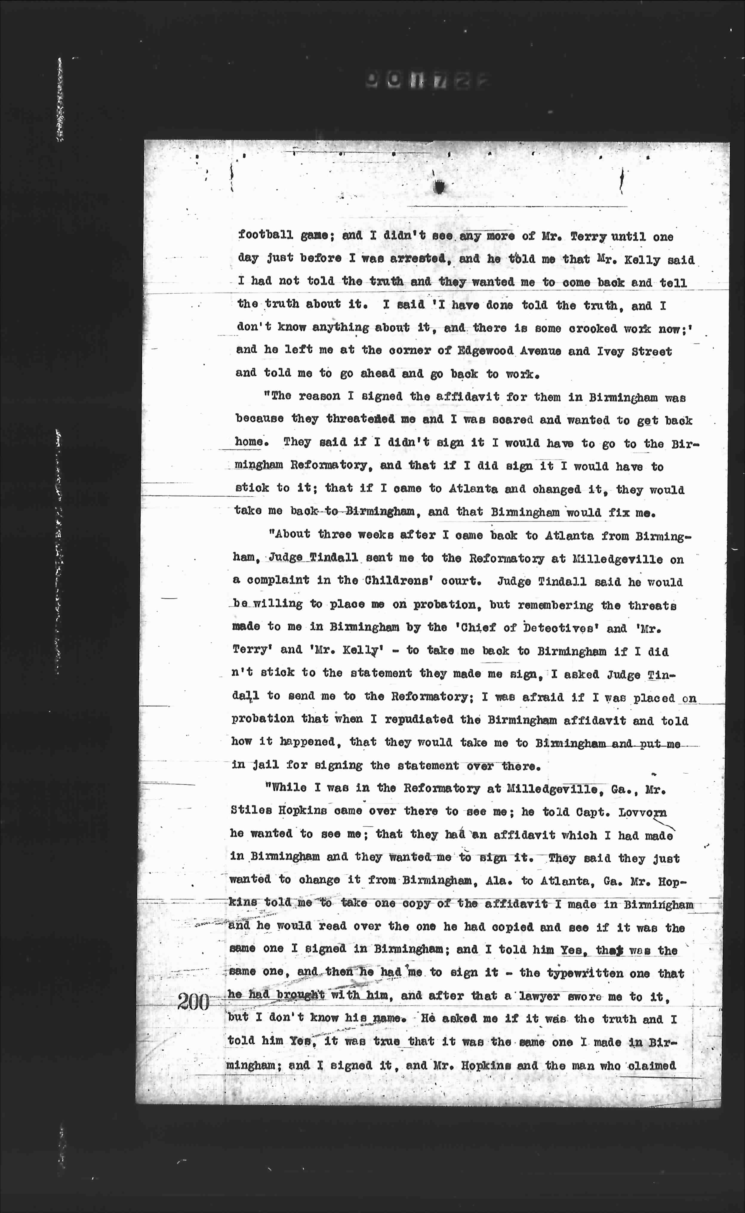 "While I was in the Reformatory at Milledgeville, Ga., Mr. Stiles Hopkins came over there to see me; he told Capt. Lovorn he wanted to see me; that they had an affidavit which I had made in Birmingham and they wanted me to sign it. They said they just wanted to change it from Birmingham, Ala. to Atlanta, Ga. Mr. Hopkins told me to take one copy of the affidavit I made in Birmingham and he would read over the one he had copied and see if it was the same one I signed in Birmingham; and I told him Yes, that was the same one, and then he had me to sign it - the typewritten one that he had brought with him, and after that a lawyer swore me to it, but I don't know his name. He asked me if it was the truth and I told him Yes, it was true that it was the same one I made in Birmingham; and I signed it, and Mr. Hopkins and the man who claimed