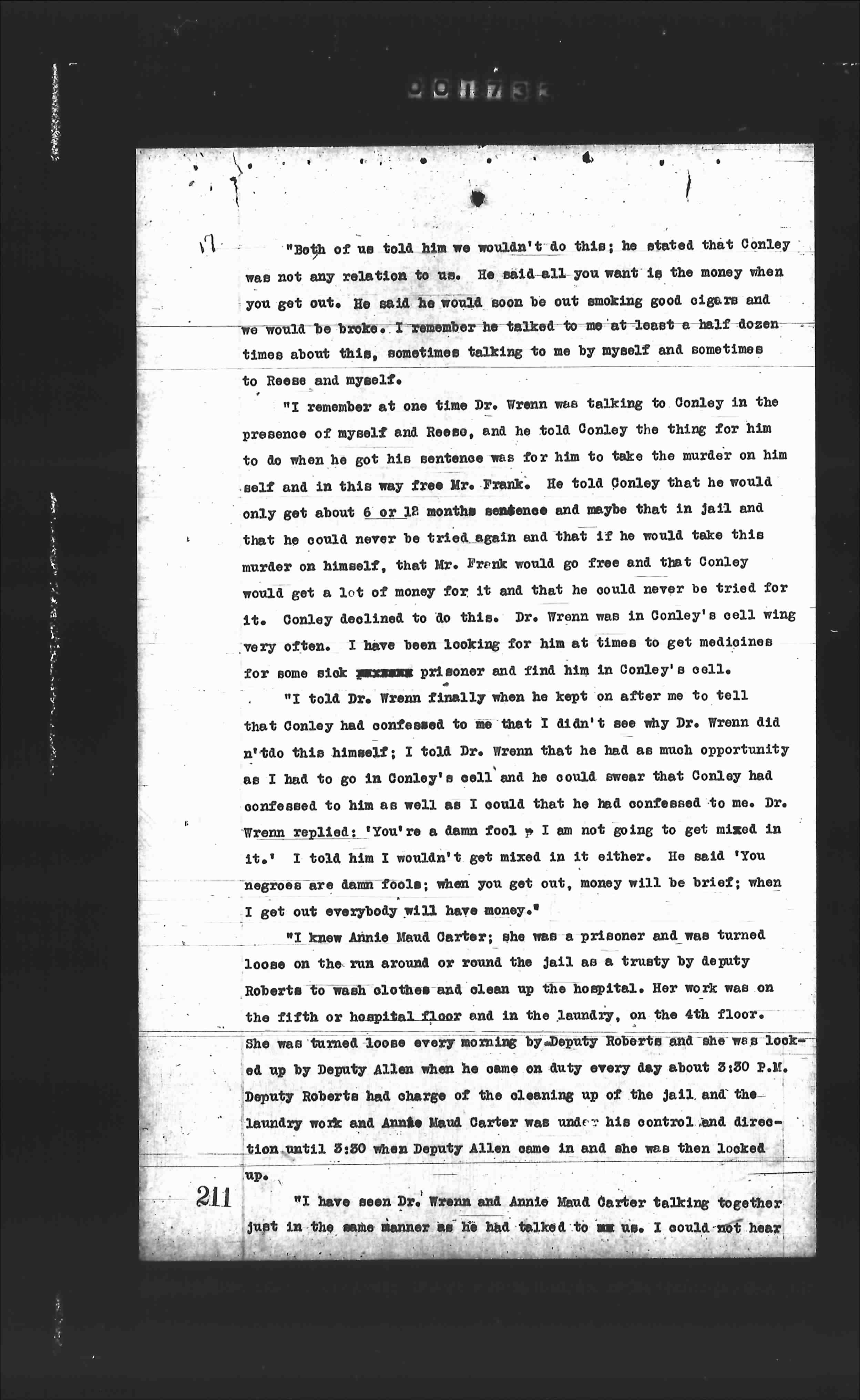 "I remember at one time Dr. Wrenn was talking to Conley in the presence of myself and Reese, and he told Conley the thing for him to do when he got his sentence was for him to take the murder on himself and in this way free Mr. Frank. He told Conley that he would only get about 6 or 12 months sentence and maybe that in jail and that he could never be tried again and that if he would take this murder on himself, that Mr. Frank would go free and that Conley would get a lot of money for it and that he could never be tried for it. Conley declined to do this. Dr. Wrenn was in Conley's cell wing very often. I have been looking for him at times to get medicines for some sick prisoners and I find him in Conley's cell.