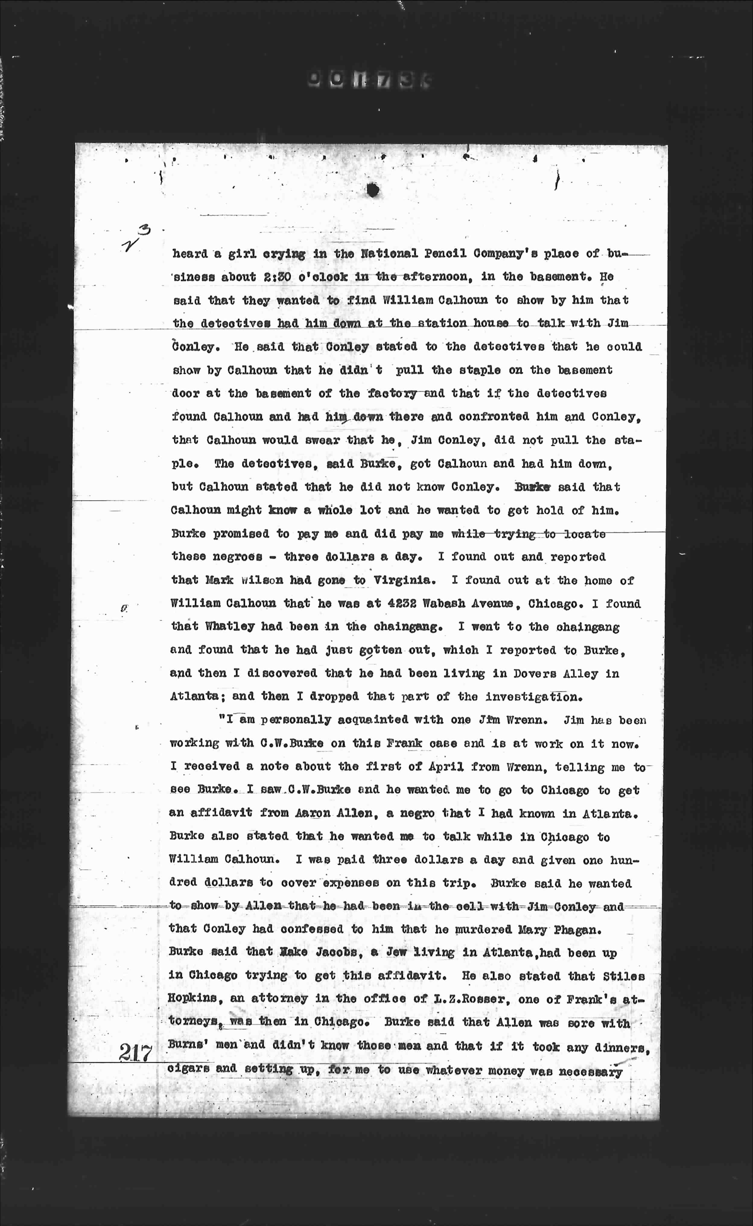 "I am personally acquainted with the firm Wrenn. Jim has been working with C.W.Burke on this Frank case and is at work on it now. I received a note about the first of April from Wrenn, telling me to see Burke. I saw C.W.Burke and he wanted me to go to Chicago to get an affidavit from Aaron Allen, a negro that I had known in Atlanta. Burke also stated that he wanted me to talk while in Chicago to William Calhoun. I was paid three dollars a day and given one hundred dollars to cover expenses on this trip. Burke said he wanted to show by Allen that he had been in the cell with Jim Conley and that Conley had confessed to him that he murdered Mary Phagan. Burke said that Mike Jacobs, a Jew living in Atlanta, had been up in Chicago trying to get this affidavit. He also stated that Stiles Hopkins, an attorney in the office of L.Z.Rosser, one of Frank's attorneys, was then in Chicago. Burke said that Allen was sore with Burns' men and didn't know those men and that if it took any dinners, cigars and setting up, for me to use whatever money was necessary