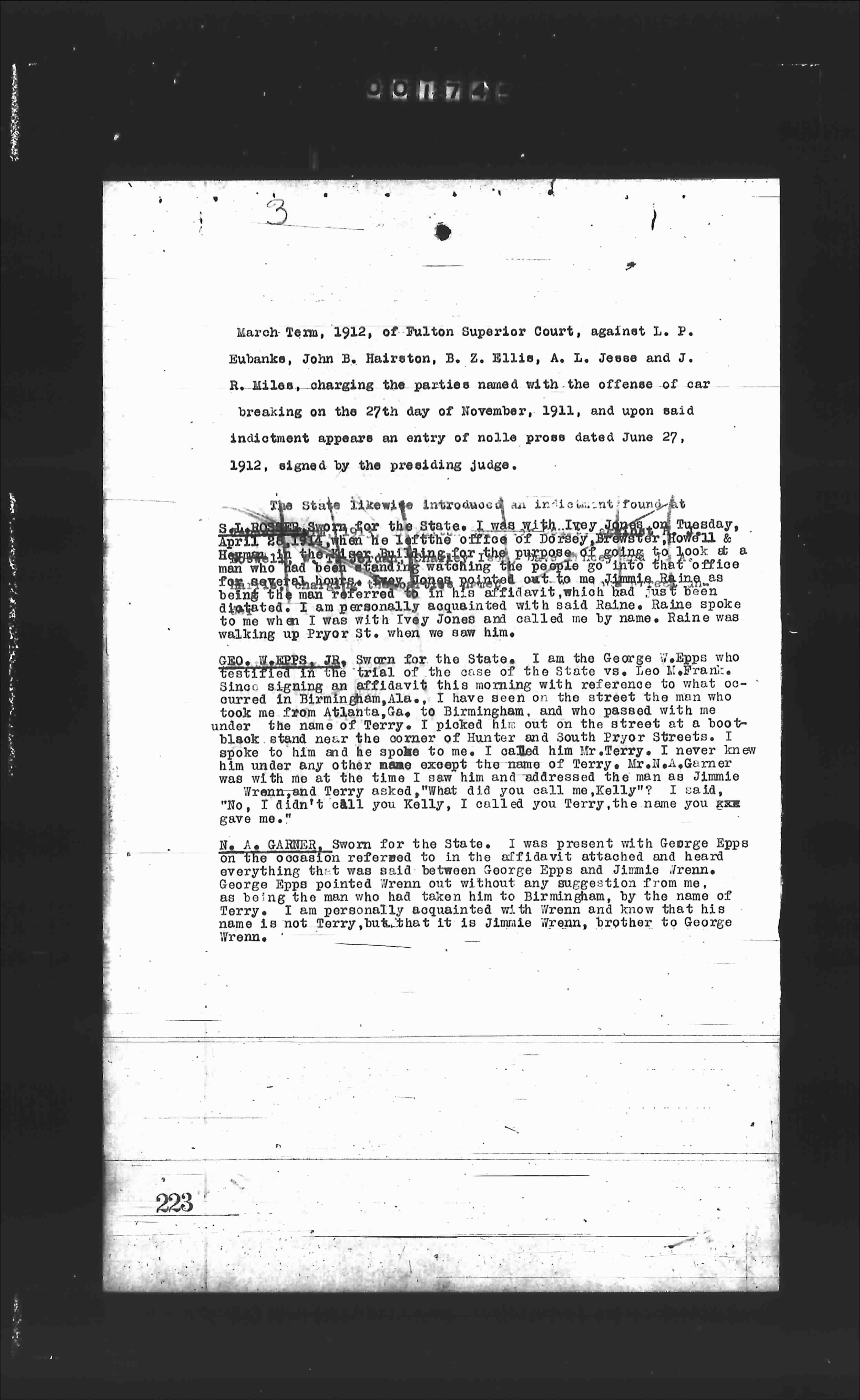 GEO. W. EPPS, JR., Sworn for the State. I am the George W. Epps who testified in the trial of the case of the State vs. Leo M. Frank. I was with Jimmie Wrenn and George Epps on the morning of the 26th of April, 1913, and we were on the street the man who took me from Atlanta, Ga., to Birmingham, and who passed with me under the name of Terry. I picked him out on the street at a bootblack stand near the corner of Hunter and South Pryor Streets. I spoke to him and he spoke to me. I called him Mr. Terry. I never knew him under any other name except the name of Terry. Mr. N. A. Garner was with me at the time I saw him and addressed the man as Jimmie Wrenn and Terry asked "what did you call me, Kelly?" I said, "No, I didn't call you Kelly, I called you Terry, the name you gave me."