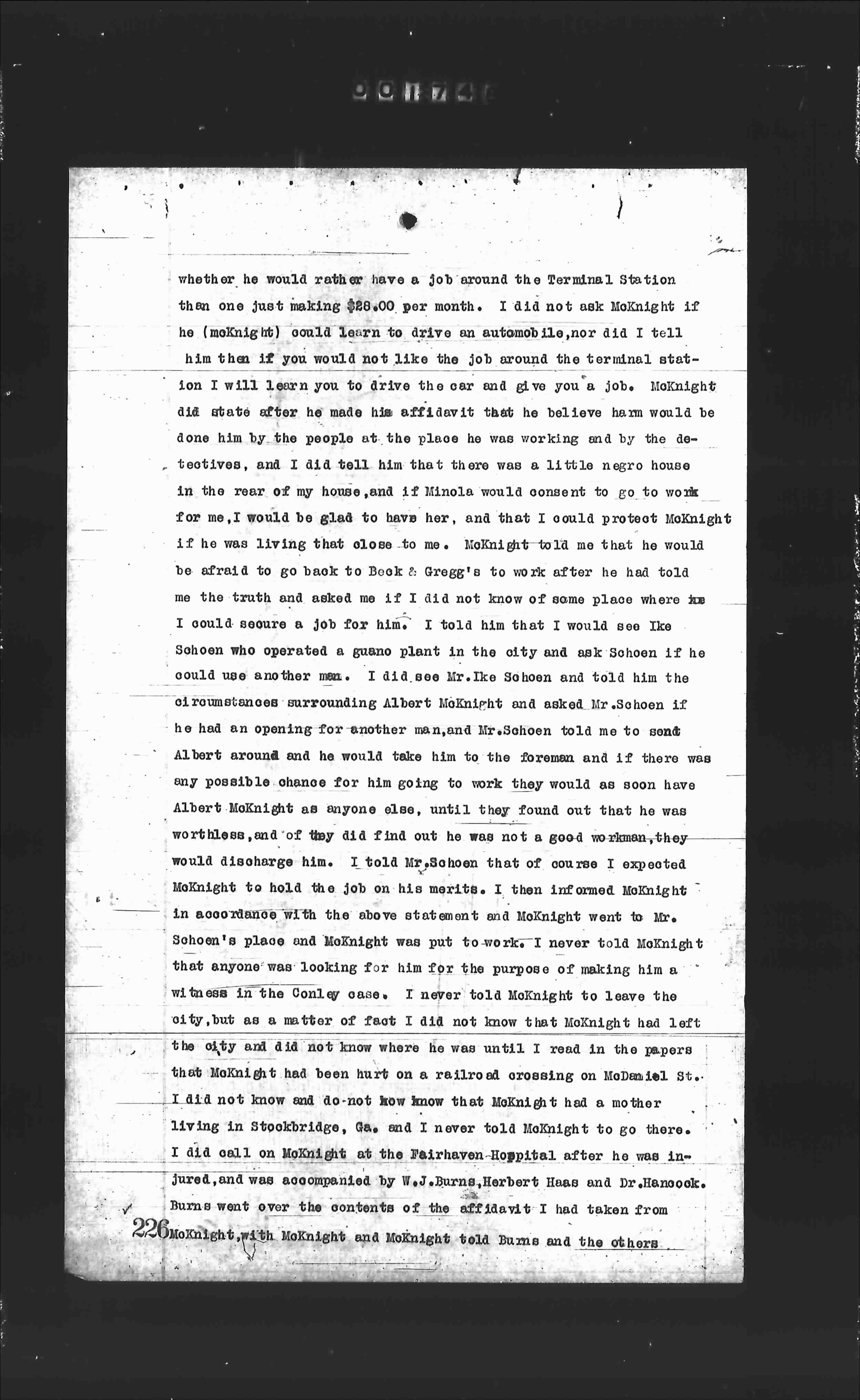 whether he would rather have a job around the Terminal Station than one just making $8.00 per month. I did not ask McKnight if he (McKnight) could learn to drive an automobile,nor did I tell him then if you would not like the job at the terminal station I will learn you to drive the car and give you a job. McKnight did state after he made his affidavit that he believe ham would be done him by the people at the place he was working and by the detectives, and I did tell him that there was a little negro house in the rear of my house, and if Minola would consent to go to work for me, I would be glad to have her, and that I could protect McKnight if he was living that close to me. McKnight told me that he would be afraid to go back to Beck & Gregg's to work after he had told me the truth and asked me if I did not know of some place where he could secure a job for him. I told him that I would see Ike Schoen who operated a guano plant in the city and ask Schoen if he could use another man. I did see Mr. Ike Schoen and told him the circumstances surrounding Albert McKnight and asked Mr.Schoen if he had an opening for another man and Mr.Schoen told me to send Albert around and he would take him to the foreman and if there was any possible chance for him going to work they would as soon have Albert McKnight as anyone else, until they found out that he was worthless, and of they did find out he was not a good workman,they would discharge him. I told Mr.Schoen that of course I expected McKnight to hold the job on his merits. I then informed McKnight in accordance with the above statement and McKnight went to Mr. Schoen's place and McKnight was put to work. I never told McKnight that anyone was looking for him for the purpose of making him a witness in the Conley case. I never told McKnight to leave the city, but as a matter of fact I did not know that McKnight had left the city and did not know where he was until I read in the papers that McKnight had been hurt on a railroad crossing on McDaniel St. I did not know and do not know that McKnight had a mother living in Stockbridge, Ga, and I never told McKnight to go there. I did call on McKnight at the Fairhaven Hospital after he was injured, and was accompanied by W.J.Burns, Herbert Haas and Dr.Hanook. Burns went over the contents of the affidavit I had taken from McKnight,with McKnight and McKnight told Burns and the others