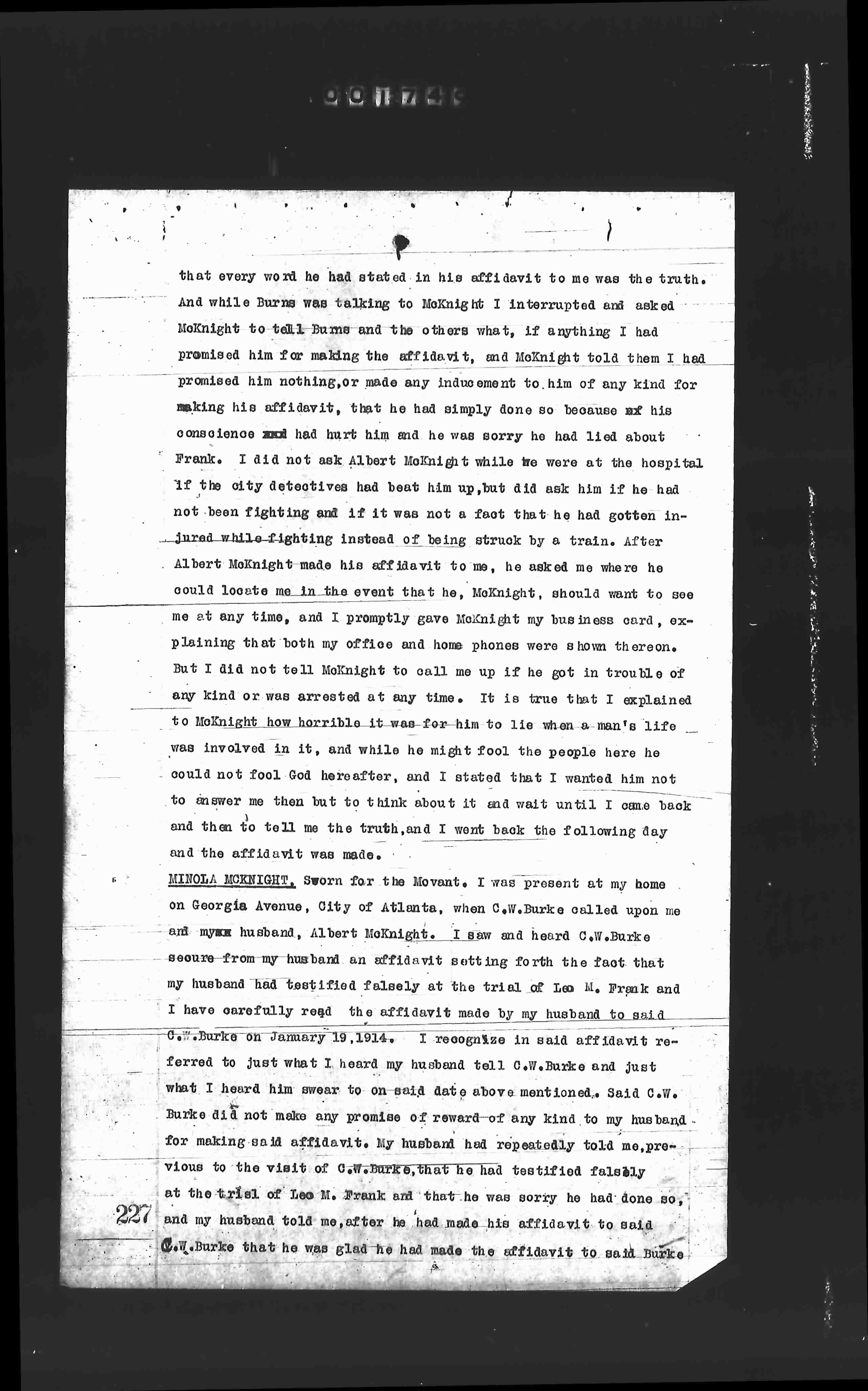 MIKOLA MCKNIGHT, Sworn for the Movant. I was present at my home on Georgia Avenue, City of Atlanta, when C.W.Burke called upon me and my husband, Albert McKnight. I saw and heard C.W.Burke secure from my husband an affidavit setting forth the fact that my husband had testified falsely at the trial of Leo M. Frank and I have carefully read the affidavit made by my husband to said C.W.Burke on January 19,1914. I recognize in said affidavit referred to just what I heard my husband tell C.W.Burke and just what I heard him swear to on said date above mentioned. Said C.W. Burke did not make any promise of reward of any kind to my husband for making said affidavit. My husband had repeatedly told me,previous to the visit of C.W.Burke,that he had testified falsely at the trial of Leo M. Frank and that he was sorry he had done so, and my husband told me,after he had made his affidavit to said C.W.Burke that he was glad he had made the affidavit to said Burke