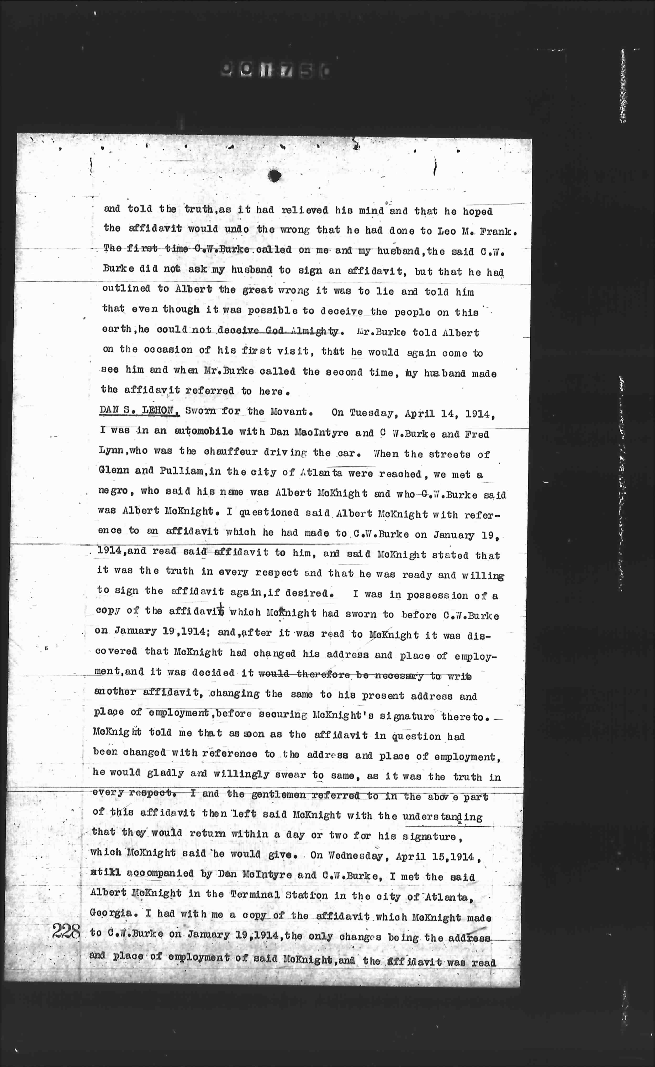 DAN S. LEHON, Sworn for the Movant. On Monday, April 14, 1914, I was in an automobile with Dan MacIntyre and C.W.Burke and Fred Lynn, who was the chauffeur driving the car. When the streets of Glenn and Pulliam, in the city of Atlanta were reached, we met a negro, who said his name was Albert McKnight and who C.W.Burke said was Albert McKnight. I questioned said Albert McKnight with reference to an affidavit which he had made to C.W.Burke on January 19, 1914, and read said affidavit to him, and said McKnight stated that it was the truth in every respect and that he was ready and willing to sign the affidavit again, if desired. I was in possession of a copy of the affidavit which McKnight had sworn to before C.W.Burke on January 19, 1914; and after it was read to him, it was discovered that McKnight had changed his address and place of employment, and it was decided it would therefore be necessary to write another affidavit, changing the same to his present address and place of employment, before securing McKnight's signature thereto. McKnight told me that as soon as the affidavit in question had been changed with reference to the address and place of employment, he would gladly and willingly swear to same, as it was the truth in every respect. I and the gentlemen referred to in the above part of this affidavit then left said McKnight with the understanding that they would return within a day or two for his signature, which McKnight said he would give. On Wednesday, April 15, 1914, I and accompanied by Dan McIntyre and C.W.Burke, I met the said Albert McKnight in the Terminal Station in the city of Atlanta, Georgia. I had with me a copy of the affidavit which McKnight made to C.W.Burke on January 19, 1914, the only change being the address and place of employment of said McKnight, and the affidavit was read