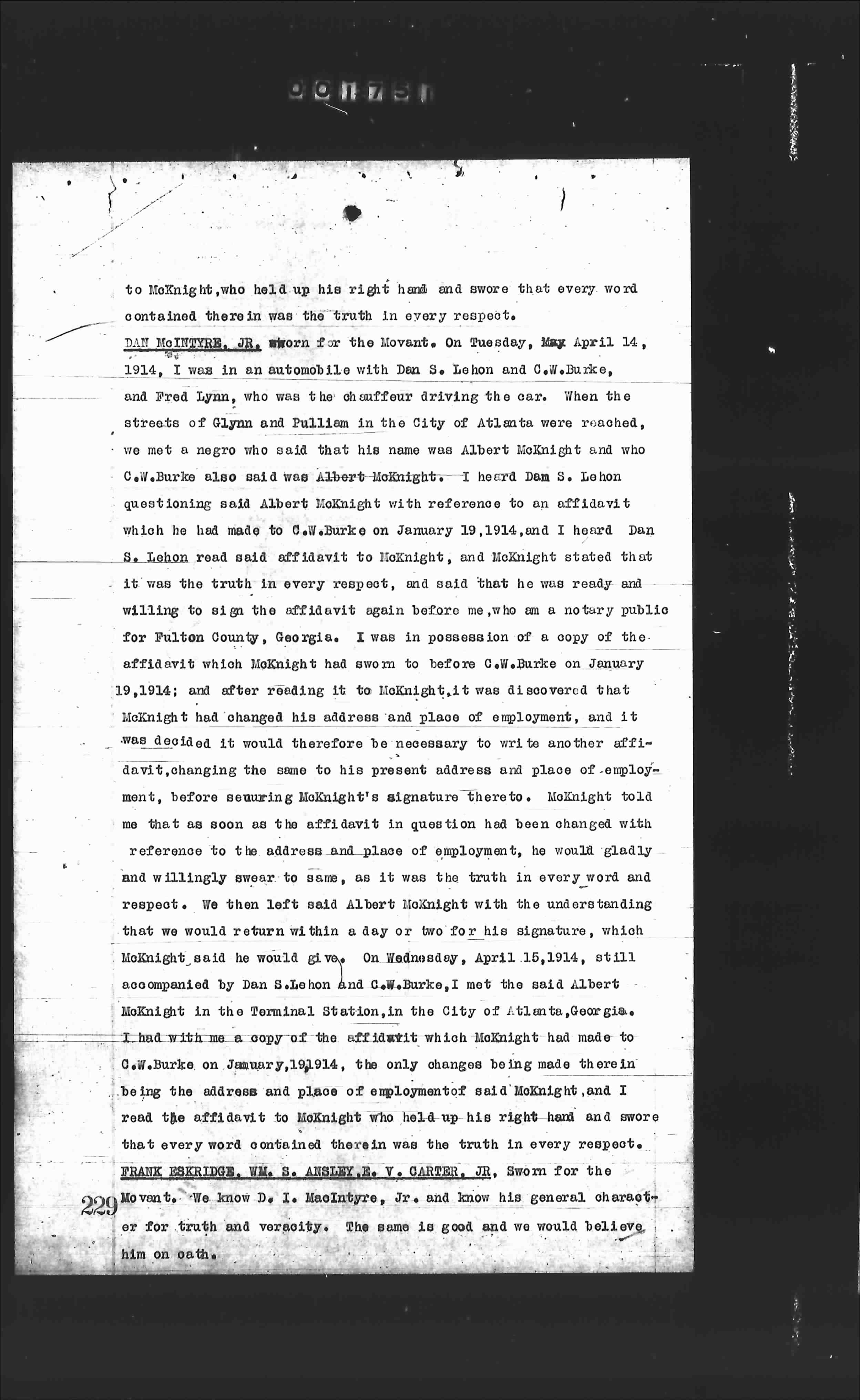 DAM McINTYRE, JR., sworn for the Movant. On Tuesday, May April 14, 1914, I was in an automobile with Dan S. Lehon and C.W.Burke, and Fred Lynn, who was the chauffeur driving the car. When the streets of Glynn and Pulliam in the City of Atlanta were reached, we met a negro who said that his name was Albert McKnight and who C.W.Burke also said was Albert McKnight. I heard Dan S. Lehon questioning said Albert McKnight with reference to an affidavit which he had made to C.W.Burke on January 19,1914, and I heard Dan S. Lehon read said affidavit to McKnight, and McKnight stated that it was the truth in every respect, and said that he was ready and willing to sign the affidavit again before me, who am a notary public for Fulton County, Georgia. I was in possession of a copy of the affidavit which McKnight had sworn to before C.W.Burke on January 19,1914; and after reading it to McKnight, it was discovered that McKnight had changed his address and place of employment, and it was decided it would therefore be necessary to write another affidavit, changing the same to his present address and place of employment, before securing McKnight's signature thereto. McKnight told me that as soon as the affidavit in question had been changed with reference to the address and place of employment, he would gladly and willingly swear to same, as it was the truth in every word and respect. We then left said Albert McKnight with the understanding that we would return within a day or two for his signature, which McKnight said he would give. On Wednesday, April 15,1914, still accompanied by Dan S.Lehon and C.W.Burke, I met the said Albert McKnight in the Terminal Station, in the City of Atlanta, Georgia. I had with me a copy of the affidavit which McKnight had made to C.W.Burke on January 19,1914, the only changes being made therein being the address and place of employment of said McKnight, and I read the affidavit to McKnight who held up his right hand and swore that every word contained therein was the truth in every respect.