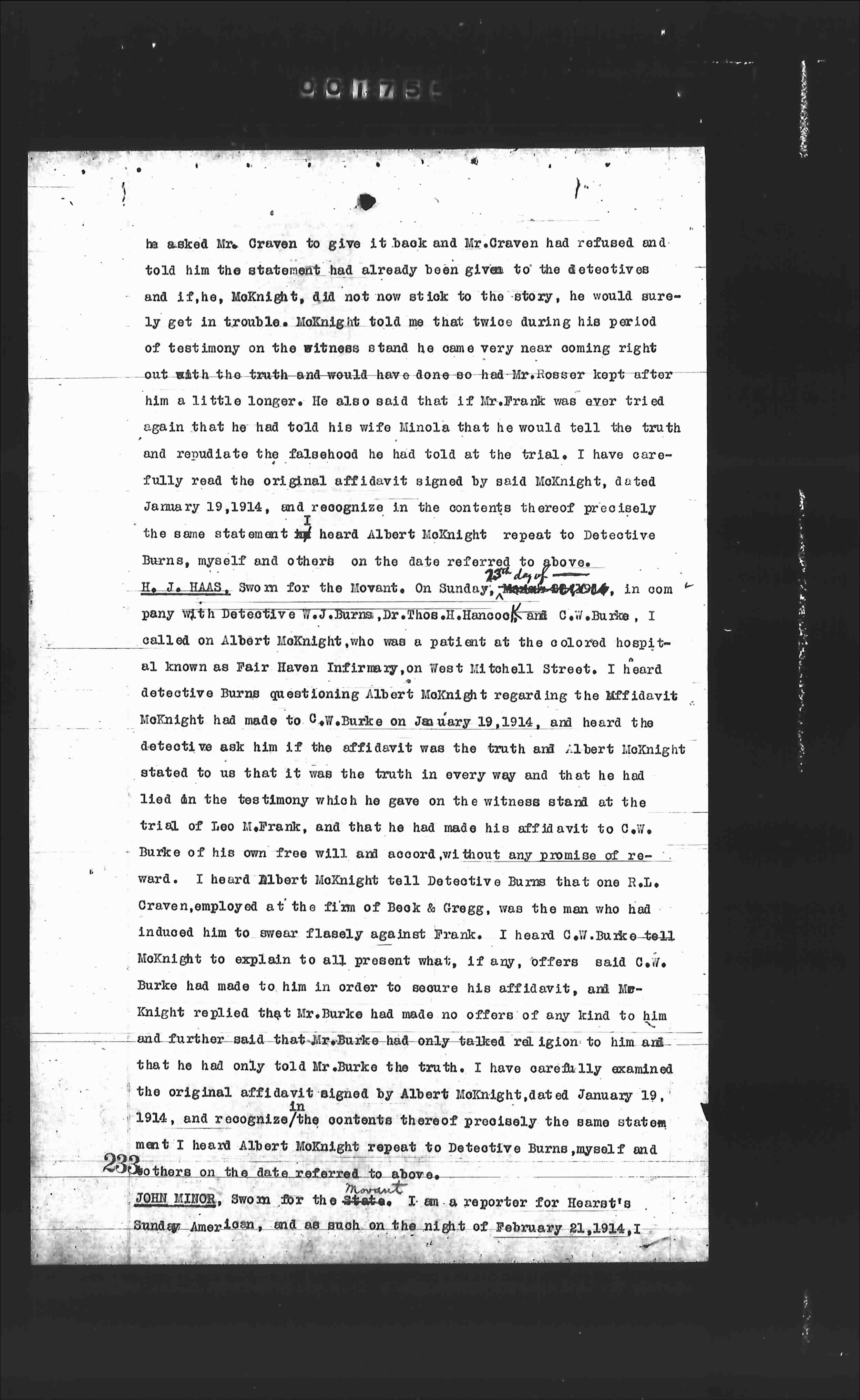 H. J. HAAS, Sworn for the State. On Sunday, January 25, 1914, in company with Detective W.J.Burns, Dr.Thos.H.Hancock and C.W.Burke, I called on Albert McKnight, who was a patient at the colored hospital known as Fair Haven Infirmary, on West Mitchell Street. I heard detective Burns questioning Albert McKnight regarding the affidavit McKnight had made to C.W.Burke on January 19,1914, and heard the detective ask him if the affidavit was the truth and Albert McKnight stated to us that it was the truth in every way and that he had lied on the testimony which he gave on the witness stand at the trial of Leo M.Frank, and that he had made his affidavit to C.W. Burke of his own free will and accord, without any promise of reward. I heard Albert McKnight tell Detective Burns that one R.J. Craven, employed at the film of Beek & Gregg, was the man who had induced him to swear falsely against Frank. I heard C.W.Burke tell McKnight to explain to all present what, if any, offers said C.W. Burke had made to him in order to secure his affidavit, and McKnight replied that Mr.Burke had made no offers of any kind to him and further said that Mr.Burke had only talked religion to him and that he had only told Mr.Burke the truth. I have carefully examined the original affidavit signed by Albert McKnight, dated January 19, 1914, and recognize the contents thereof precisely the same statement I heard Albert McKnight repeat to Detective Burns, myself and others on the date referred to above.
