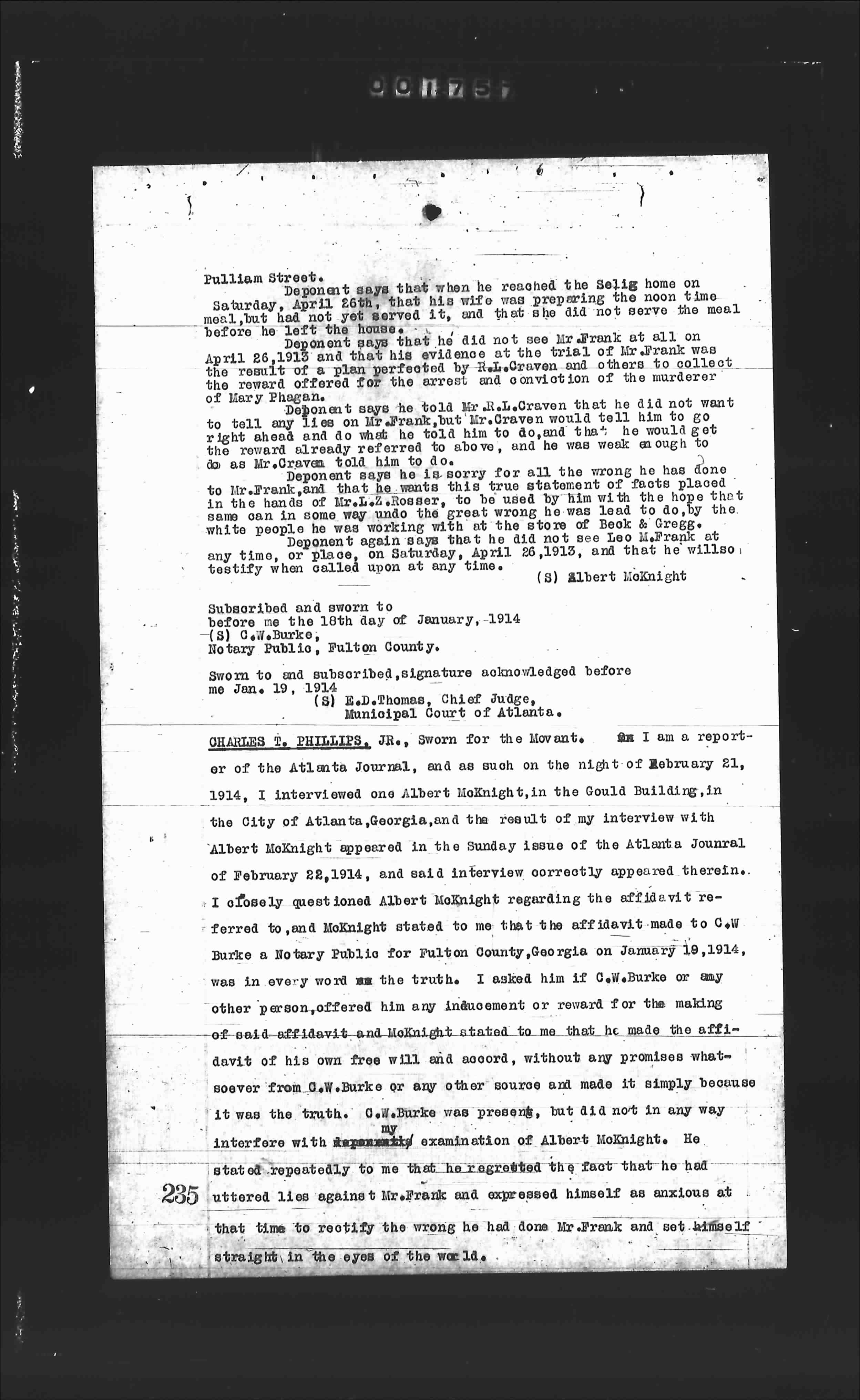 CHARLES T. PHILLIPS, JR., Sworn for the Movant. I am a reporter of the Atlanta Journal, and as such on the night of February 21, 1914, I interviewed one Albert McKnight, in the Gould Building, in the City of Atlanta, Georgia, and the result of my interview with Albert McKnight appeared in the Sunday issue of the Atlanta Journal of February 22, 1914, and said interview correctly appeared therein. I offered McKnight regarding the affidavit referred to, and McKnight stated to me that the affidavit made to C.W. Burke a Notary Public for Fulton County, Georgia on January 19, 1914, was in every word the truth. I asked him if C.W.Burke or any other person offered him any inducement or reward for the making of said affidavit and McKnight stated to me that he made the affidavit of his own free will and accord, without any promises whatsoever from C.W.Burke or any other source and made it simply because it was the truth. C.W.Burke was present, but did not in any way interfere with my examination of Albert McKnight. He stated repeatedly to me that he regretted the fact that he had uttered lies against Mr.Frank and expressed himself as anxious at that time to rectify the wrong he had done Mr.Frank and set himself straight in the eyes of the world.