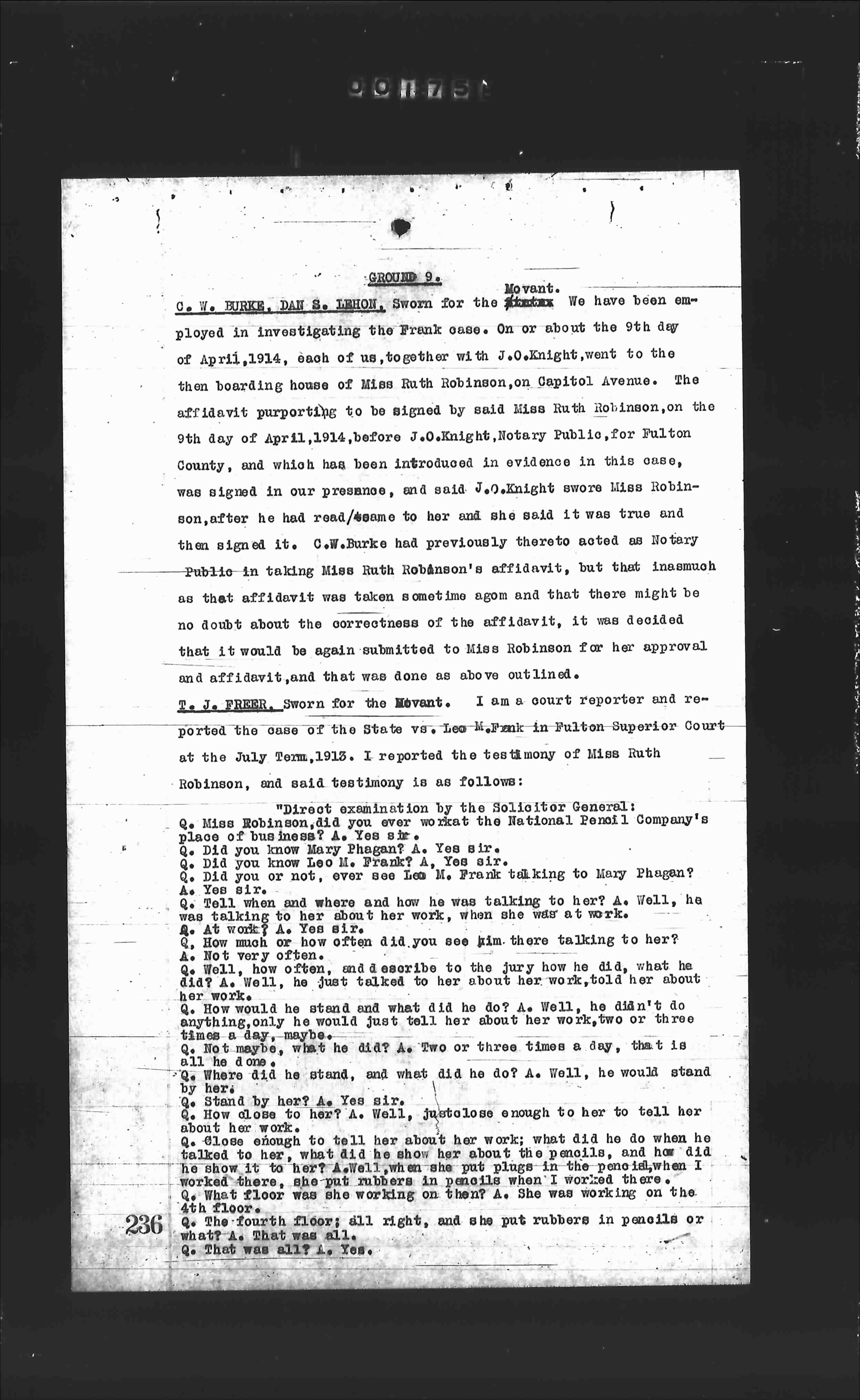 C. W. BURKE, DAN S. LEHON, Sworn for the Movant. We have been employed in investigating the Frank case. On or about the 9th day of April, 1914, each of us, together with J. O. Knight, went to the then boarding house of Miss Ruth Robinson, 404 Capitol Avenue. The affidavit purporting to be signed by said Miss Ruth Robinson, on the 9th day of April, 1914, before J. O. Knight, Notary Public, for Fulton County, and which has been introduced in evidence in this case, was signed in our presence, and said J. O. Knight swore Miss Robinson, after he had read same to her and she said it was true and then signed it. C. W. Burke had previously thereto acted as Notary Public in taking Miss Ruth Robinson's affidavit, but that inasmuch as that affidavit was taken sometime ago and that there might be no doubt about the correctness of the affidavit, it was decided that it would be again submitted to Miss Robinson for her approval and affidavit, and that was done as above outlined.