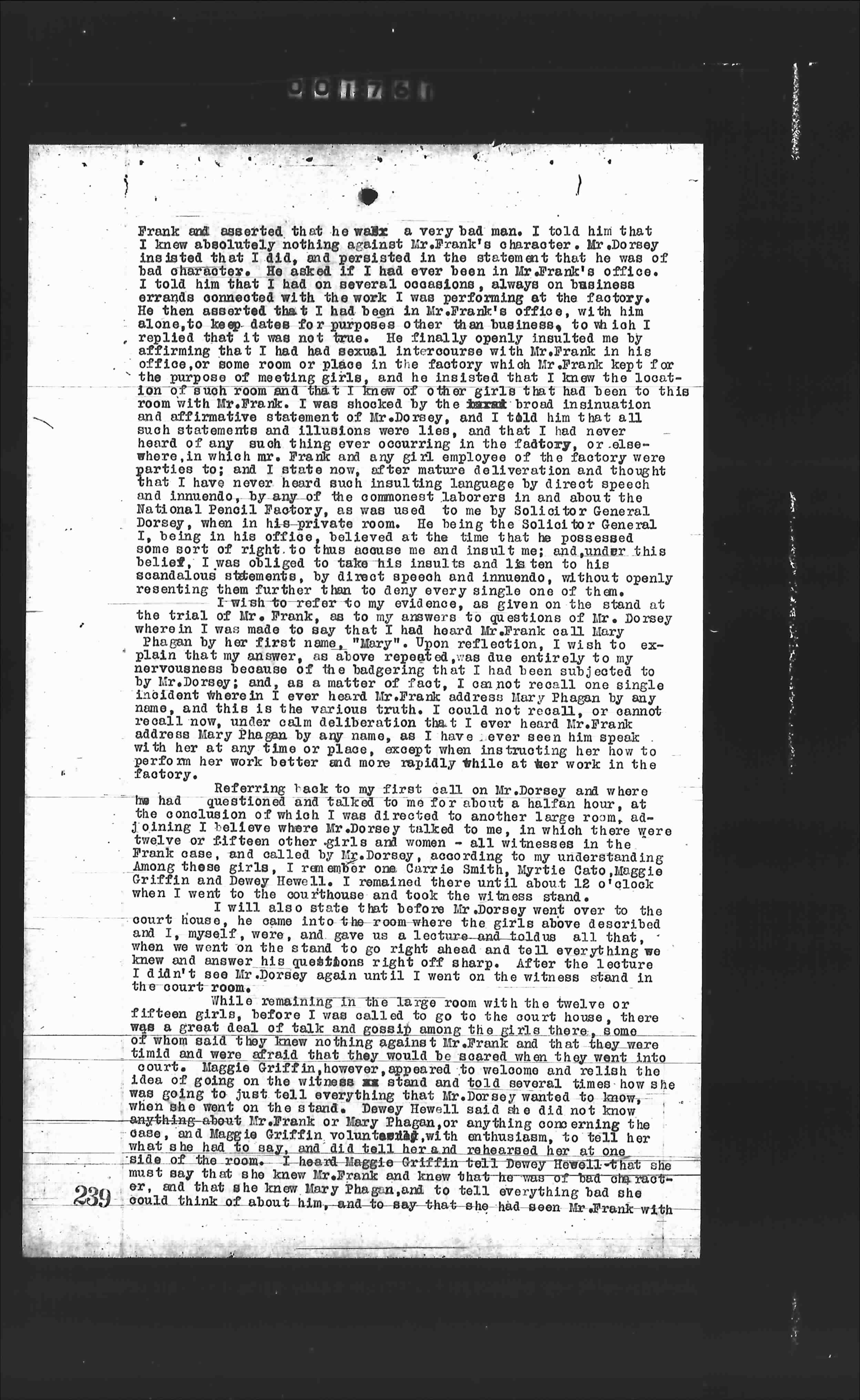 I wish to refer to my evidence, as given on the stand at the trial of Mr.Frank, as to my answers to questions of Mr.Dorsey where in I was made to say that I had heard Mr.Frank call Mary Phagan by her first name "Mary". Upon reflection, I wish to explain my answer, as although repeated, was due entirely to my nervousness and fright. I had been badgered and bullied by Mr.Dorsey and as a matter of fact, I had been subjected to an indignity where in I ever heard Mr.Frank address Mary Phagan by name, and this is the verious truth. I could not recall or cannot recall now, under calm deliberation that I ever heard Mr.Frank address Mary Phagan by name, as I have never seen him speak with her at any time or place, except when instructing her how to perform her work better and more rapidly while at her work in the factory. Referring back to my first call on Mr.Dorsey and where he had questioned and talked to me for about half an hour, at the conclusion of which I was directed to go into a large room, adjoining I believe where Mr.Dorsey talked to me, where there were twelve or fifteen other girls and women - all employees in the factory. I was called by Mr.Dorsey, according to my understanding among these girls, I remember Carrie Smith, Myrtle Cato, Maggie Griffin and Dewey Howell. I remained there until about 12 o'clock when I went to the courthouse and took the witness stand.