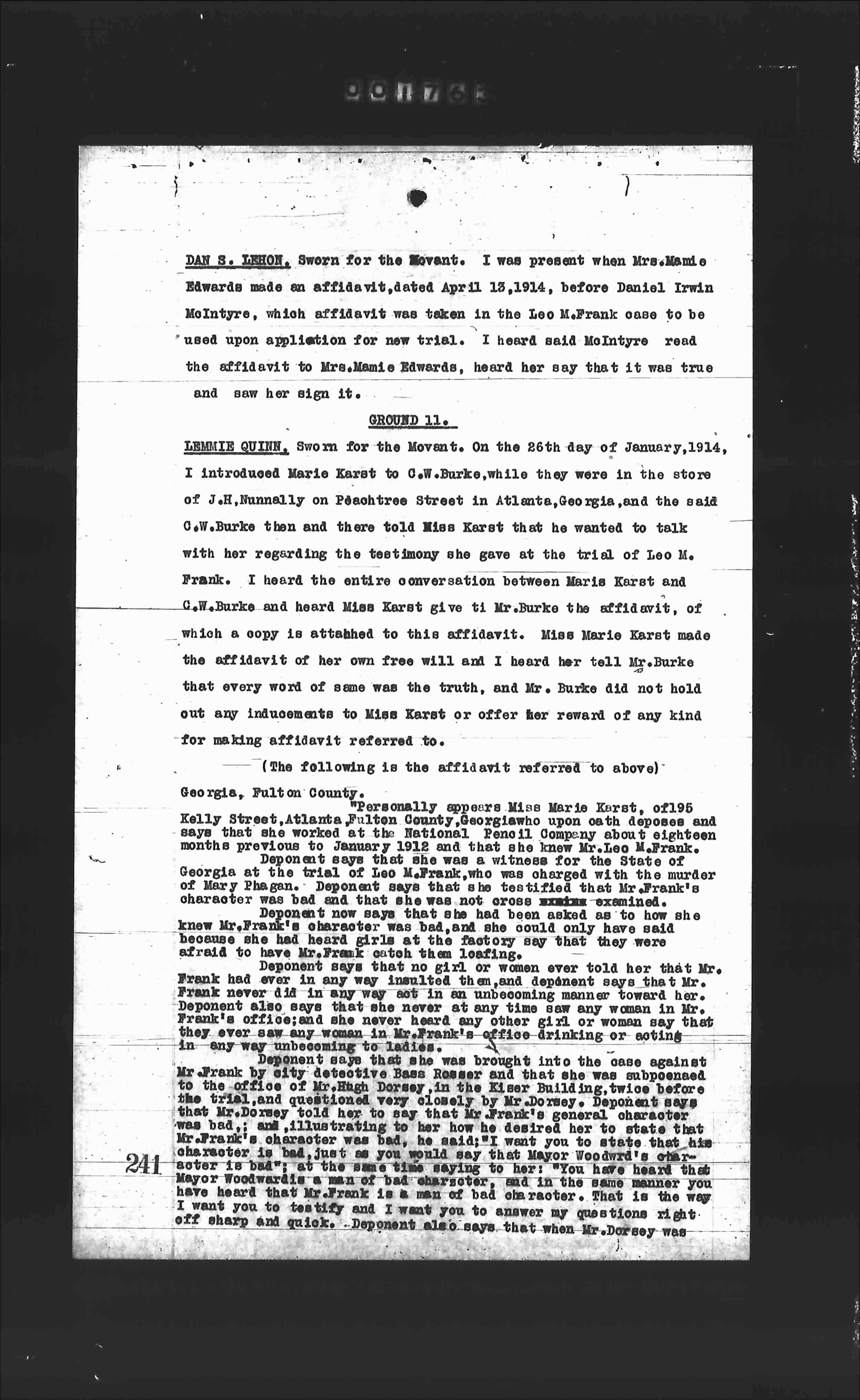 On the 26th day of January,1914, I introduced Marie Karst to G.W.Burke,while they were in the store of J.H.Nunnally on Peachtree Street in Atlanta,Georgia,and the said G.W.Burke then and there told Miss Karst that he wanted to talk with her regarding the testimony she gave at the trial of Leo M. Frank.