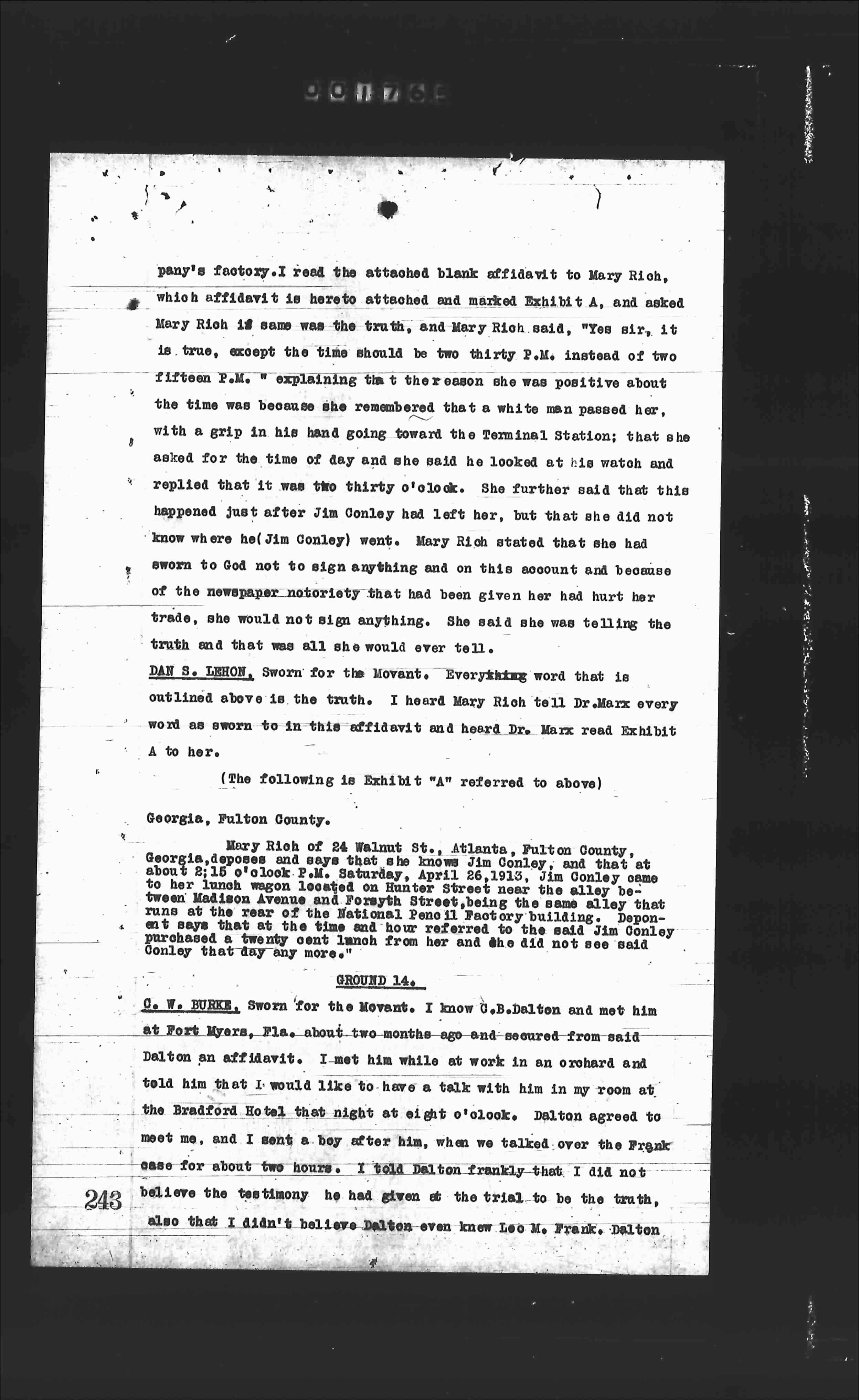 pany's factory. I read the attached blank affidavit to Mary Rich, which affidavit is hereto attached and marked Exhibit 'A, and asked Mary Rich if same was the truth, and Mary Rich said, "Yes sir, it is true, except the time should be two thirty P.M. instead of two fifteen P.M." explaining the reason she was positive about the time was because she remembered that as she passed her, with a grip in his hand going toward the Terminal Station; that she asked for the time of day and she said he looked at his watch and replied that it was two thirty o'clock. She further said that this happened just after Jim Conley had left her, but that she did not know where he (Jim Conley) went. Mary Rich stated that she had sworn to God not to sign anything and on this account and because of the newspaper notoriety that had been given her had hurt her trade, she would not sign anything. She said she was telling the truth and that was all she would ever tell.