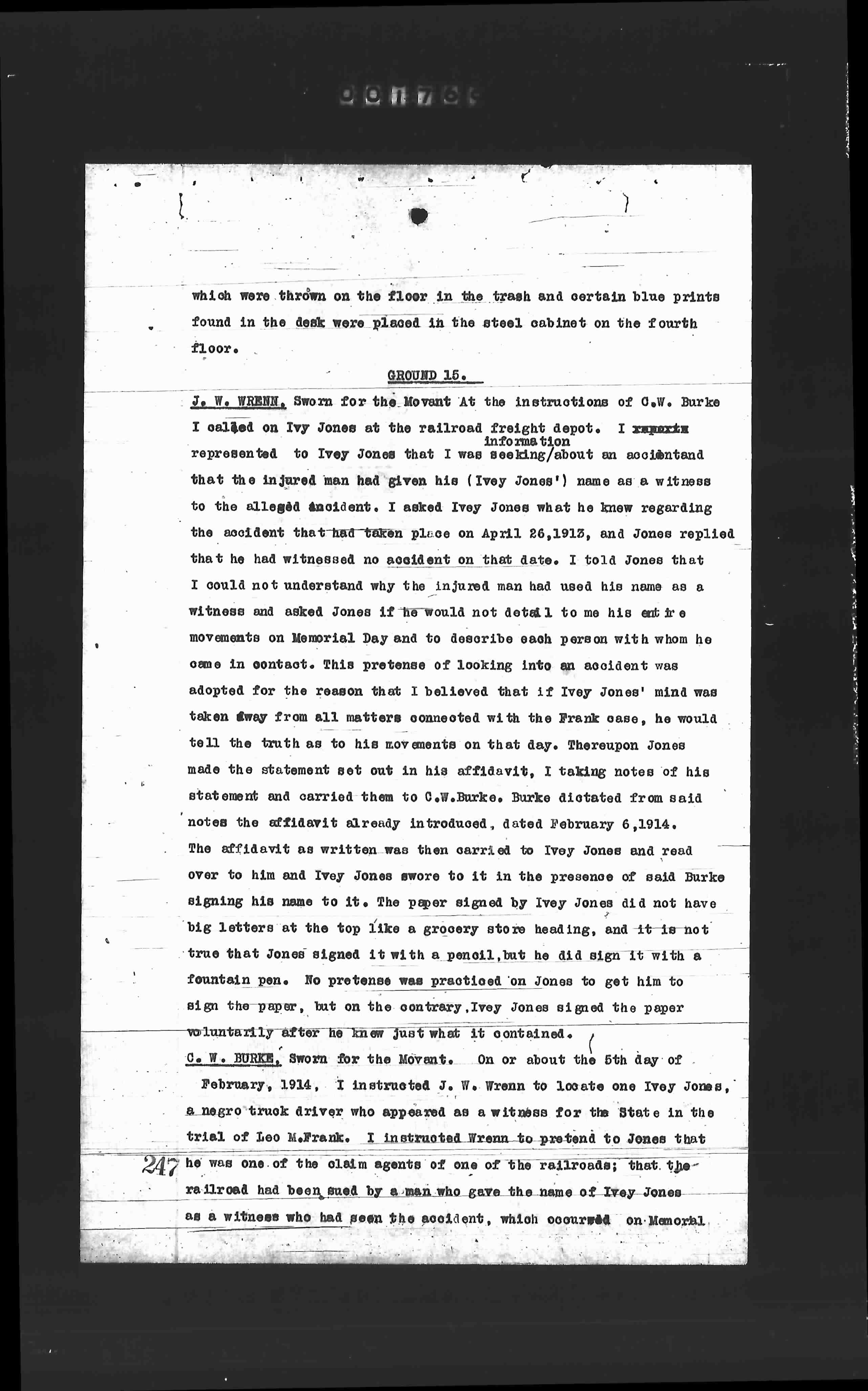 J. W. WRENN, Sworn for the Movent: At the instructions of C.W. Burke I called on Ivy Jones at the railroad freight depot. I represented to Ivey Jones that I was seeking/about an accident and that the injured man had given his (Ivey Jones') name as a witness to the alleged accident. I asked Ivey Jones what he knew regarding the accident that had taken place on April 26,1913, and Jones replied that he had witnessed no accident on that date. I told Jones that I could not understand why the injured man had used his name as a witness and asked Jones if he would not detail to me his entire movements on Memorial Day and to describe each person with whom he came in contact. This pretense of looking into an accident was adopted for the reason that I believed that if Ivey Jones' mind was taken away from all matters connected with the Frank case, he would tell the truth as to his movements on that day. Thereupon Jones made the statement set out in his affidavit, I taking notes of his statement and carried them to C.W.Burke. Burke dictated from said notes the affidavit already introduced, dated February 6,1914. The affidavit as written was then carried to Ivey Jones and read over to him and Ivey Jones swore to it in the presence of said Burke signing his name to it. The paper signed by Ivey Jones did not have big letters at the top like a grocery store heading, and it is not true that Jones signed it with a pencil, but he did sign it with a fountain pen. No pretense was practiced on Jones to get him to sign the paper, but on the contrary, Ivey Jones signed the paper voluntarily after he knew just what it contained.