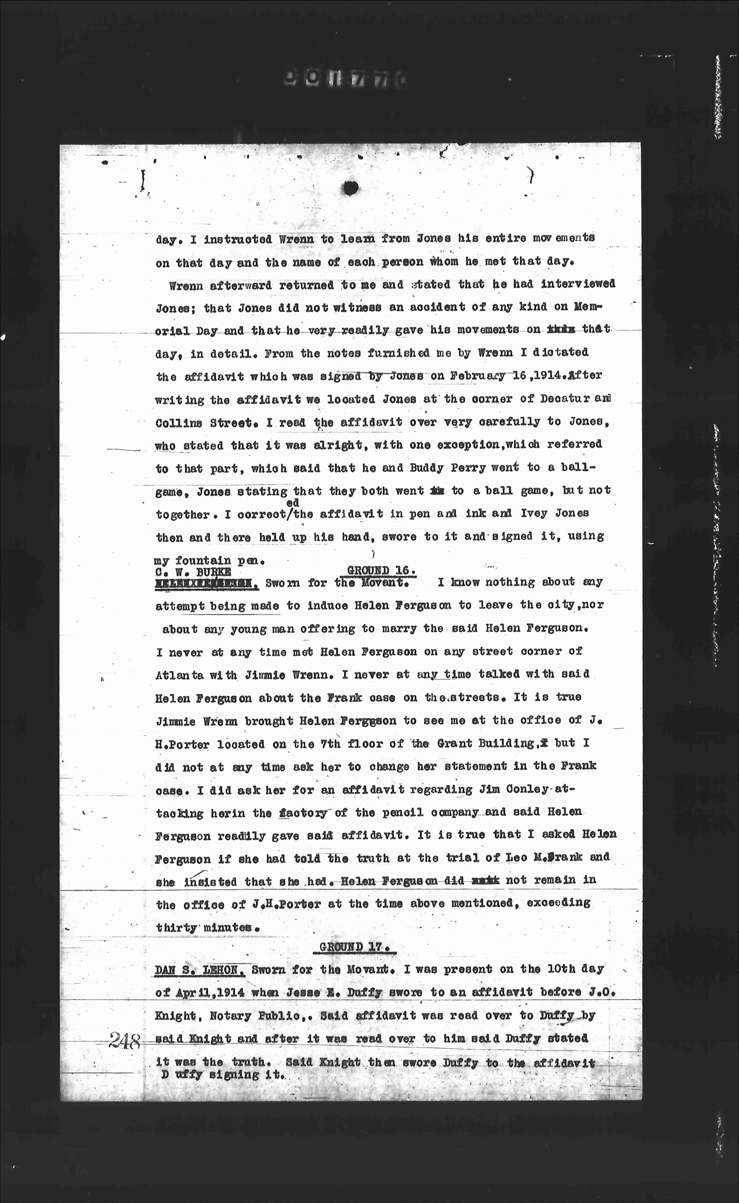 HERBERT H. BURKE, sworn for the Movant:- I know nothing about any attempt being made to induce Helen Ferguson to leave the city, nor about any young man offering to marry the said Helen Ferguson. I never at any time met Helen Ferguson on any street corner of Atlanta with Jimmie Wrenn. I never at any time talked with said Helen Ferguson about the Frank case on the streets. It is true Jimmie Wrenn brought Helen Ferguson to me and at the office of J. H.Porter located on the 7th floor of the Grant Building, but I did not at any time ask her to change her statement in the Frank case. I did ask her for an affidavit regarding Jim Conley attacking her in the factory of the pencil company and said Helen Ferguson readily gave said affidavit. It is true that I asked Helen Ferguson if she had told the truth at the trial of Leo M.Frank and she insisted that she had. Helen Ferguson did not remain in the office of J.H.Porter at the time above mentioned, exceeding thirty minutes.