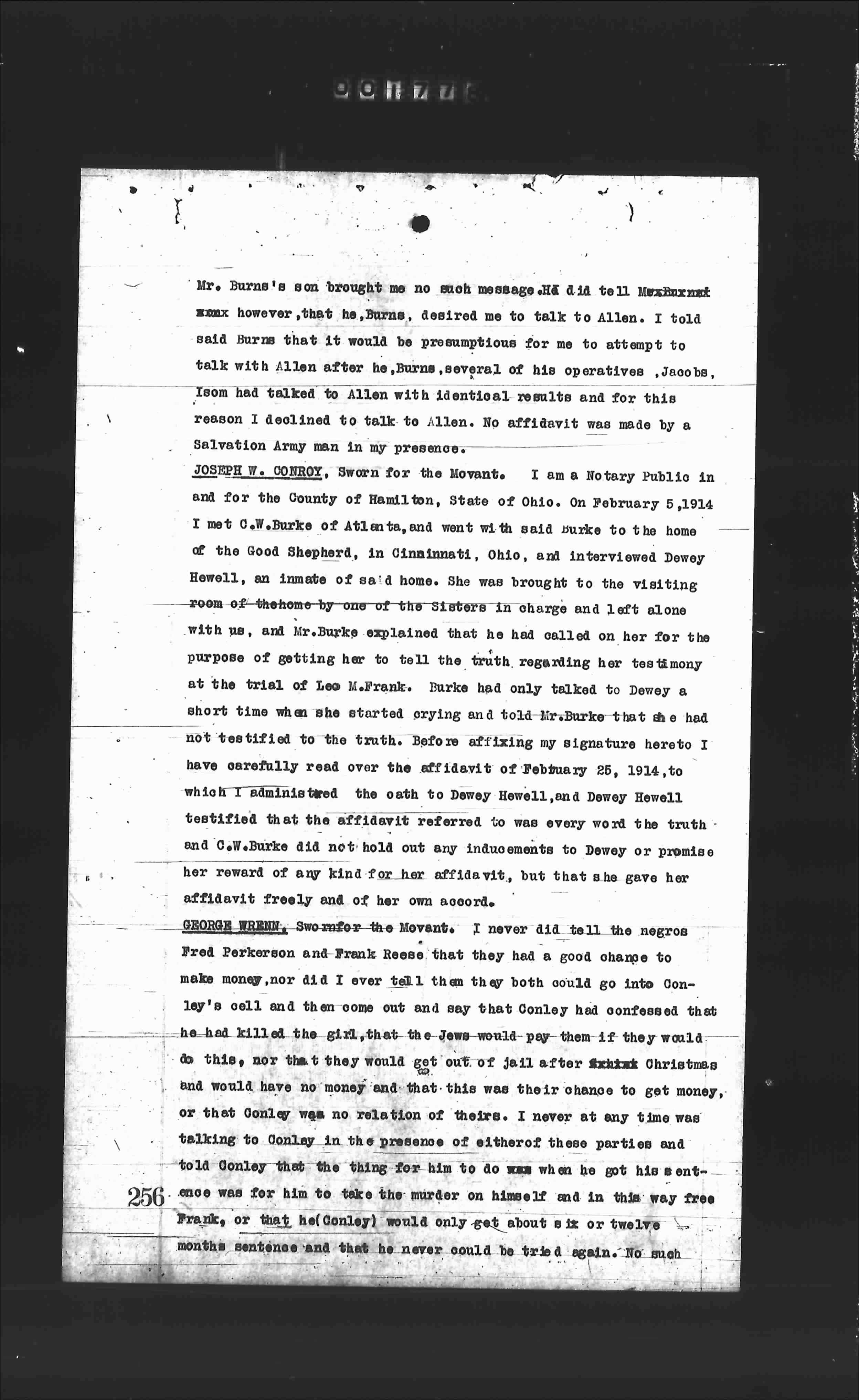 JOSEPH W. CONROY, Sworn for the Movant. I am a Notary Public in and for the County of Hamilton, State of Ohio. On February 5,1914 I met C.W.Burke of Atlanta, and went with said Burke to the home of the Good Shepherd, in Cincinnati, Ohio, and interviewed Dewey Hewell, an inmate of said home. She was brought to the visiting room of the home by one of the Sisters in charge and left alone with us, and Mr.Burke explained that he had called on her for the purpose of getting her to tell the truth, regarding her testimony at the trial of Leo M.Frank. Burke had only talked to Dewey a short time when she started crying and told Mr.Burke that she had not testified to the truth. Before affixing my signature hereto I have carefully read over the affidavit of February 25, 1914, to which I administered the oath to Dewey Hewell, and Dewey Hewell testified that the affidavit referred to was every word the truth and C.W.Burke did not hold out any inducements to Dewey or promise her reward of any kind for her affidavit, but that she gave her affidavit freely and of her own accord.
