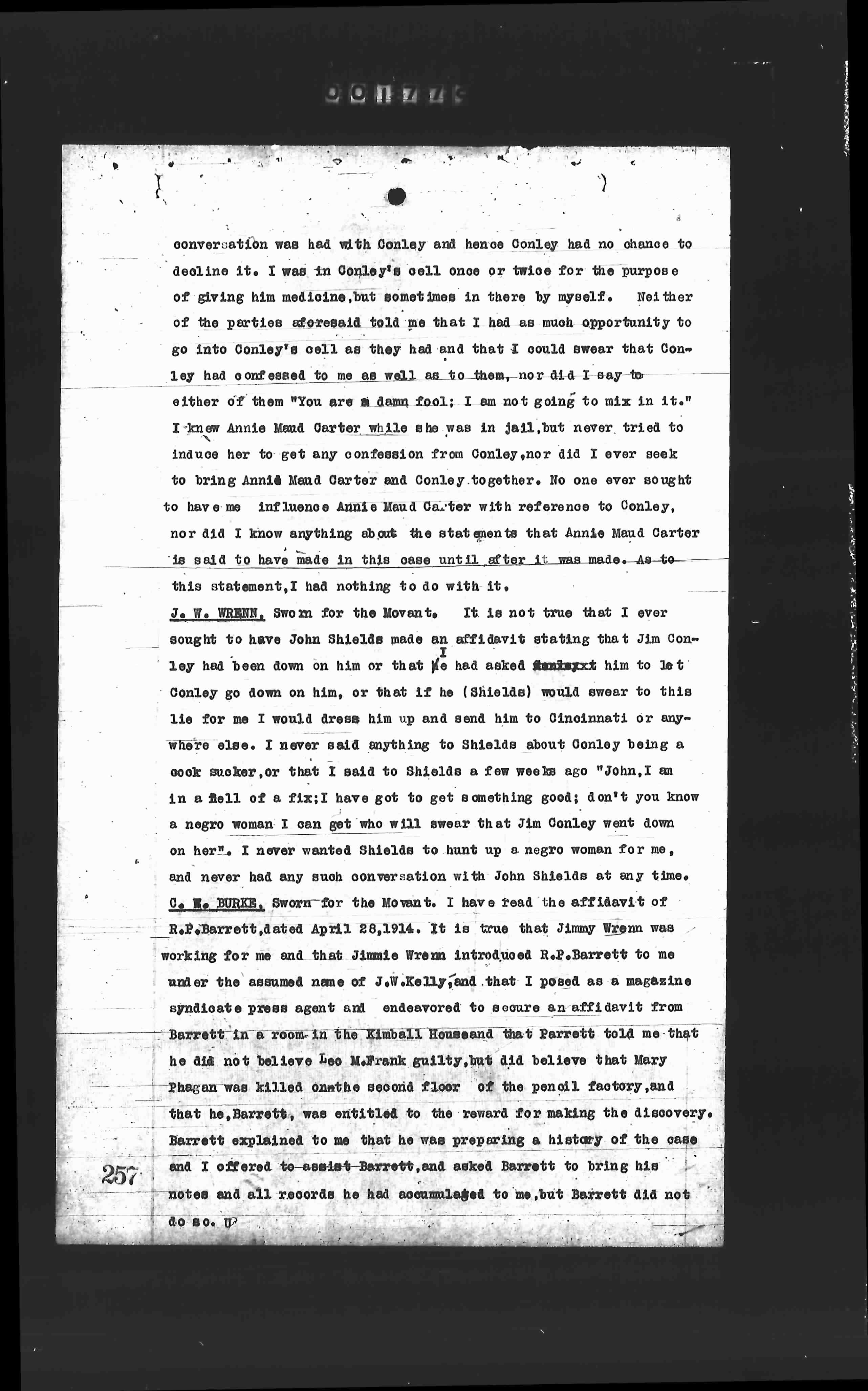 J. W. WRENN, Sworn for the Movant. It is not true that I ever sought to have John Shields made an affidavit stating that Jim Con- ley had been down on him or that he had asked Anniexxx him to let Conley go down on him, or that I said to Shields about swear to this lie for me I would dress him up and send him to Cincinnati or any- where else. I never said anything to Shields about Conley being a cook snooker, or that I said to Shields a few weeks ago "John, I am in a hell of a fix; I have got to get something good; don't you know a negro woman I can get who will swear that Jim Conley went down on her". I never wanted Shields to hunt up a negro women for me, and never had any such conversation with John Shields at any time.