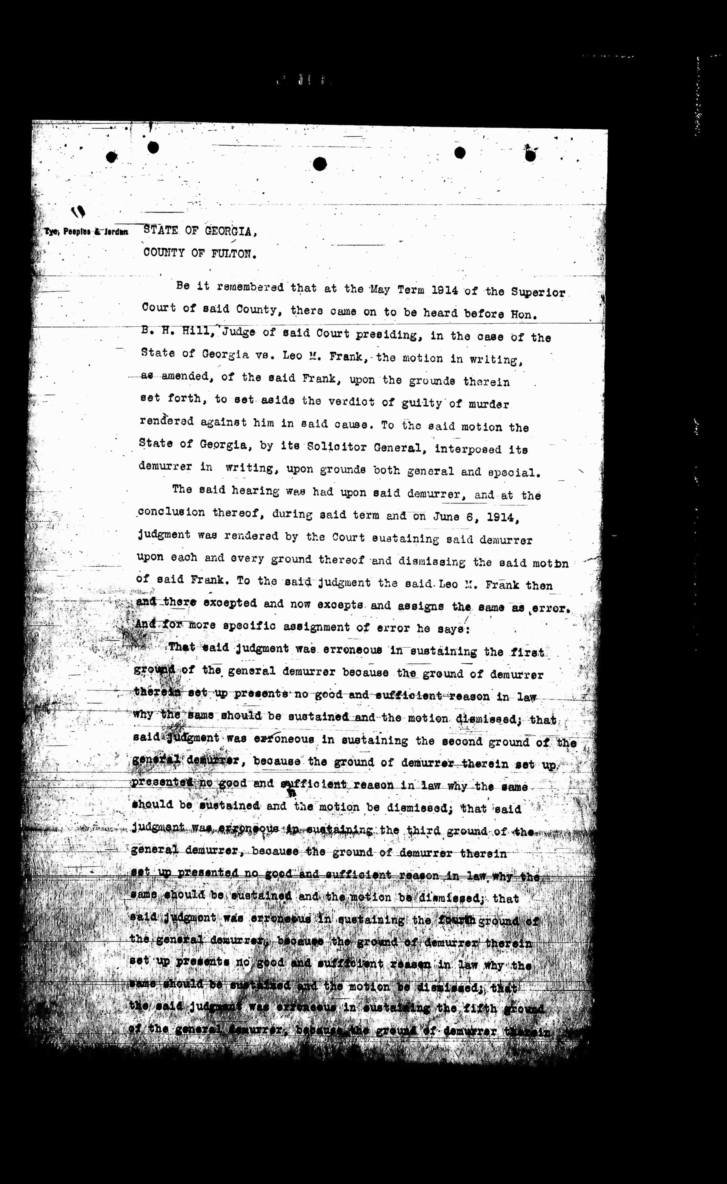 Be it remembered that at the May Term 1914 of the Superior Court of said County, there came on to be heard before Hon. B. H. Hill, Judge of said Court presiding, in the case of the State of Georgia vs. Leo M. Frank, the motion in writing, as amended, of the said Frank, upon the grounds therein set forth, to set aside the verdict of guilty of murder rendered against him in said cause. To the said motion the State of Georgia, by its Solicitor General, interposed its demurrer in writing, upon grounds both general and special. The said hearing was had said demurrer, and at the conclusion thereof, during said term end on June 6, 1914, judgment was rendered by the Court sustaining said demurrer upon each and every ground thereof and dismissing the said motion of said Frank. To the said judgment the said Leo M. Frank then and there excepted and now excepts and assigns the same as error. And for more specific assignment of error he says:
