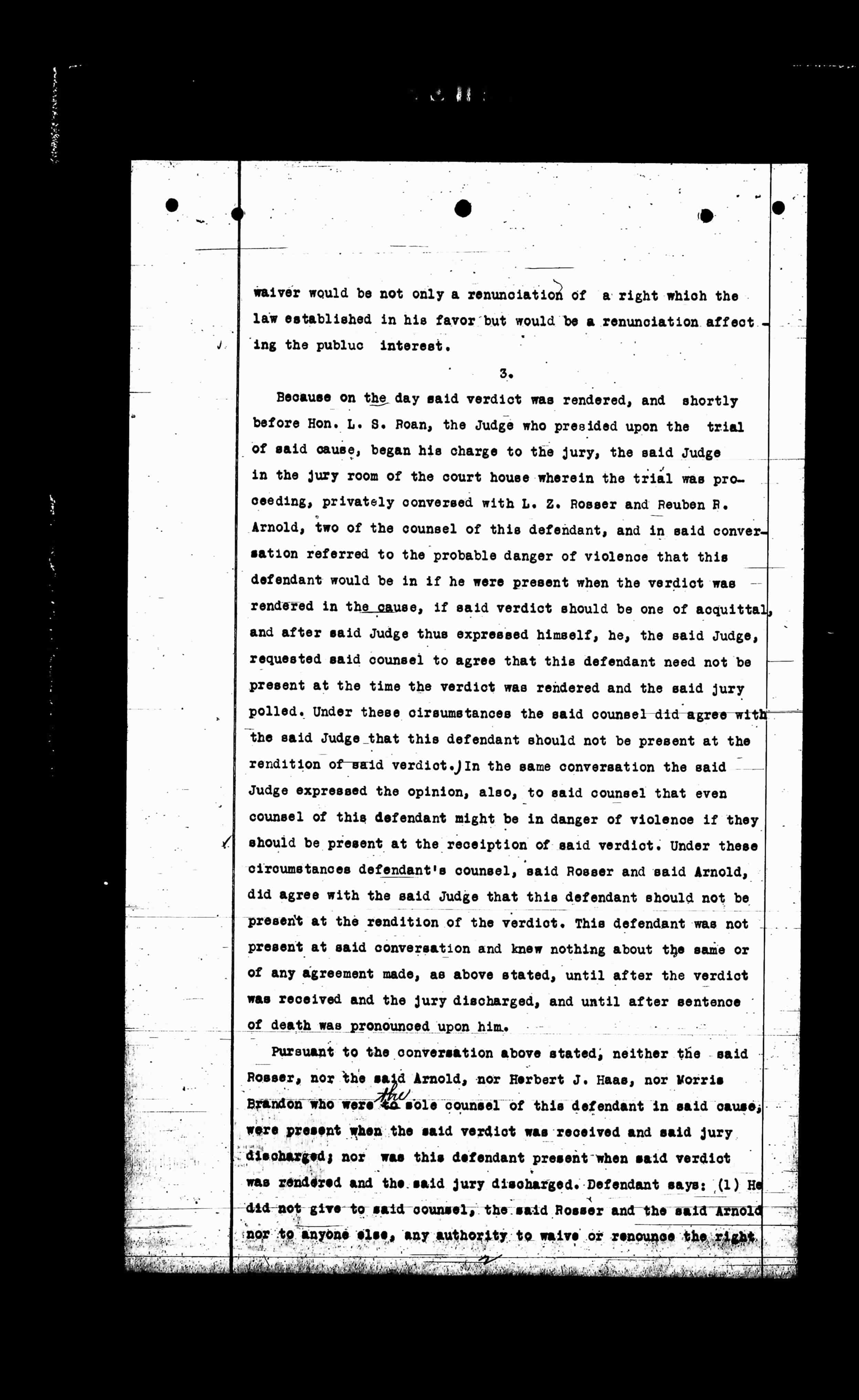 Because on the day said verdict was rendered, and shortly before Hon. L. S. Roan, the Judge who presided upon the trial of said cause, began his charge to the jury, the said Judge in the jury room of the court house wherein the trial was pro- ceeding, privately conversed with L. Z. Rosser and Reuben R. Arnold, two of the counsel of this defendant, and in said conver- sation referred to the probable danger of violence that this defendant would be in if he were present when the verdict was rendered in the cause, if said verdict should be one of acquittal, and after said Judge thus expressed himself, he, the said Judge, requested said counsel to agree that this defendant need not be present at the time the verdict was rendered and the said jury polled. Under these circumstances the said counsel did agree with the said Judge that this defendant should not be present at the rendition of said verdict.) In the same conversation the said Judge expressed the opinion, also, to said counsel that even counsel of this defendant might be in danger of violence if they should be present at the rendition of said verdict. Under these circumstances defendant's counsel, said Rosser and said Arnold, did agree with the said Judge that this defendant should not be present at the rendition of the verdict. This defendant was not present at said conversation and knew nothing about the same or of any agreement made, as above stated, until after the verdict was received and the jury discharged, and until after sentence of death was pronounced upon him.