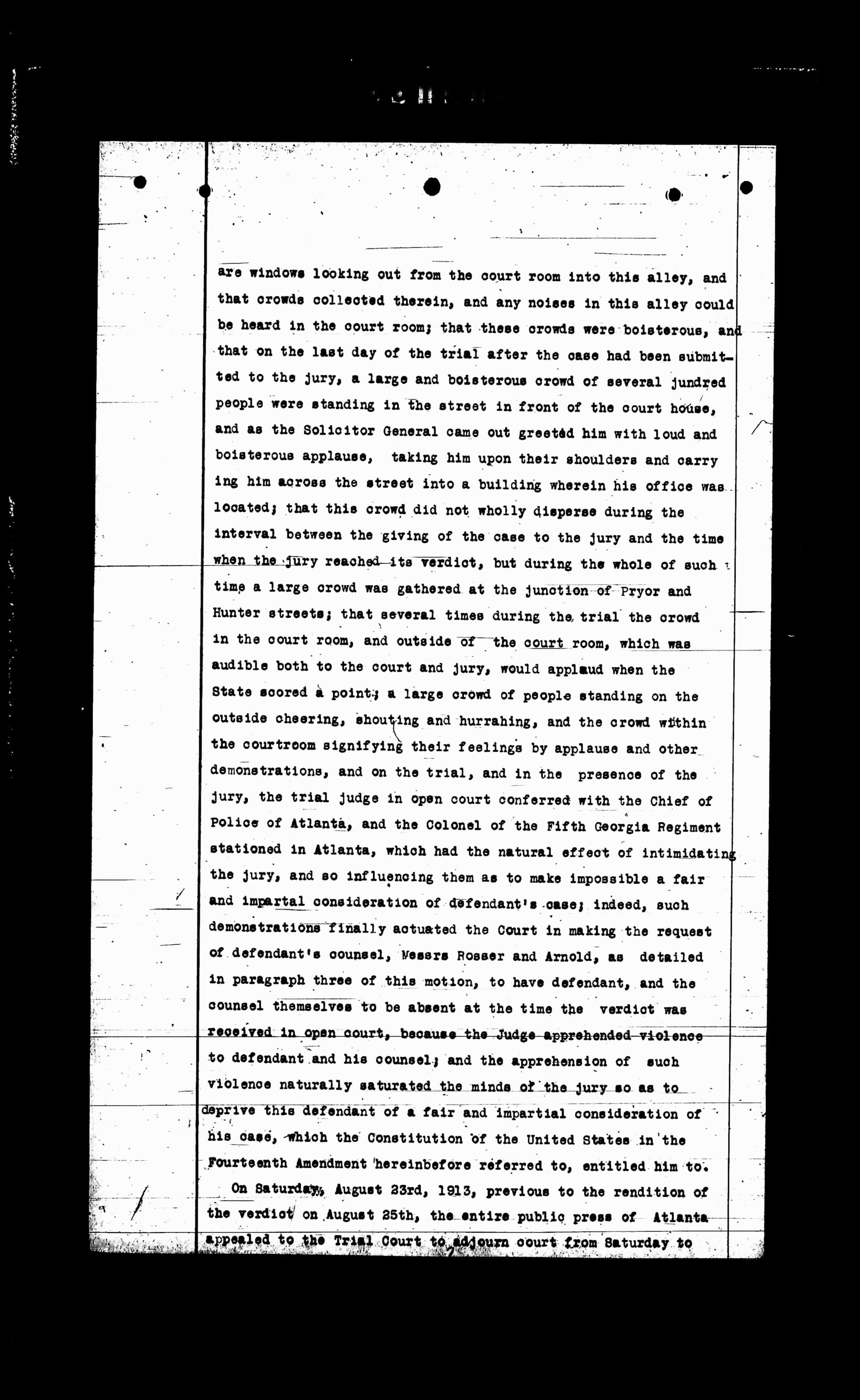 are windows looking out from the court room into this alley, and that crowds collected therein, and any noises in this alley could be heard in the court room; that these crowds were boisterous, and that on the last day of the trial, after the case had been submitted to the jury, a large and boisterous crowd of several hundred people were standing in the street in front of the court house, and as the Solicitor General came out greeted him with loud and boisterous applause, taking him upon their shoulders and carrying him across the street into a building wherein his office was located; that this crowd did not wholly disperse during the interval between the giving of the case to the jury and the time when the jury reached its verdict, but during the whole of such time a large crowd was gathered at the junction of Pryor and Hunter streets; that several times during the trial the crowd in the court room, and outside of the court room, which was audible both to the court and jury, would applaud when the State scored a point; a large crowd of people standing on the outside cheering, shouting and hurrahing, and the crowd within the courtroom signifying their feelings by applause and other demonstrations, and on the trial, and in the presence of the jury, the trial Judge in open court conferred with the Chief of Police of Atlanta, and the Colonel of the Fifth Georgia Regiment stationed in Atlanta, which had the natural effect of intimidating the jury, and so influencing them as to make impossible a fair and impartial consideration of defendant's case; indeed, such demonstrations finally actuated the Court in making the request of defendant's counsel, Messrs. Rosser and Arnold, as detailed in paragraph three of this motion, to have defendant, and the counsel themselves to be absent at the time the verdict was received in open court, because the Judge apprehended violence to defendant and his counsel; and the apprehension of such violence naturally saturated the minds of the jury so as to deprive this defendant of a fair and impartial consideration of his case, which the Constitution of the United States in the Fourteenth Amendment hereinbefore referred to, entitled him to. On Saturday, August 23rd, 1913, previous to the rendition of the verdict on August 25th, the entire public press of Atlanta appealed to the Trial Court to adjourn court from Saturday to