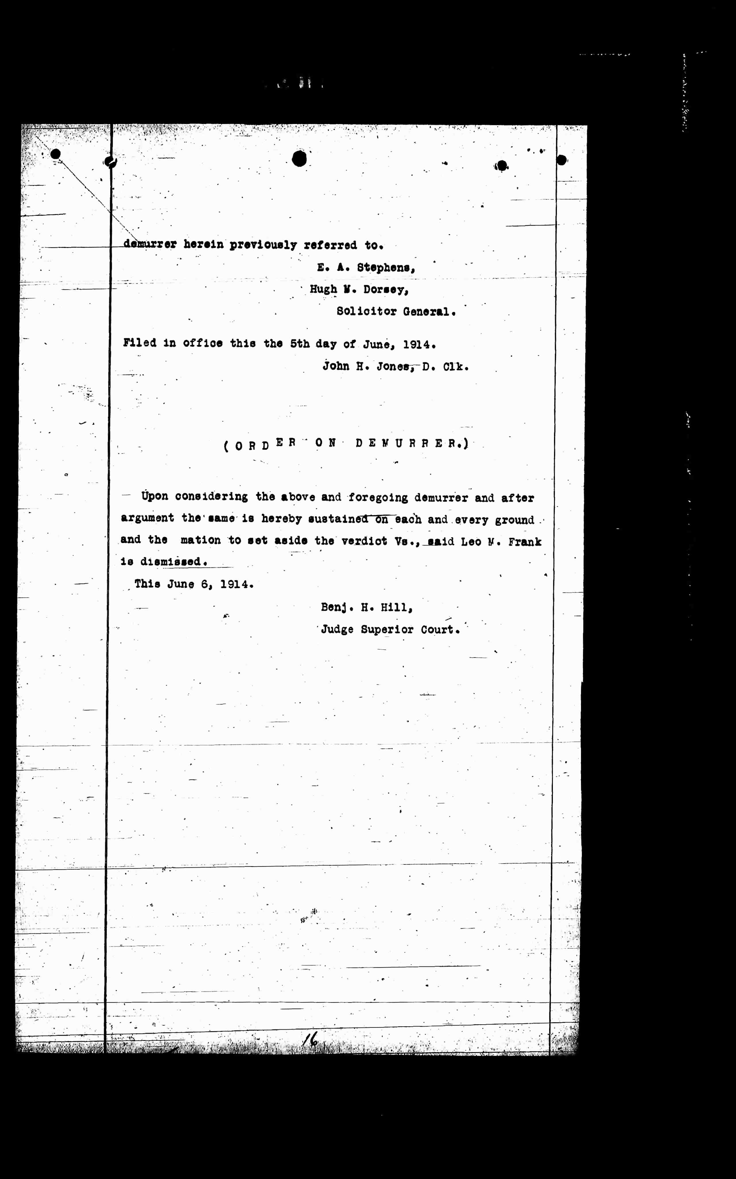 Upon considering the above and foregoing demurrer and after argument the same is hereby sustained on each and every ground and the motion to set aside the verdict vs., said Leo M. Frank is dismissed.