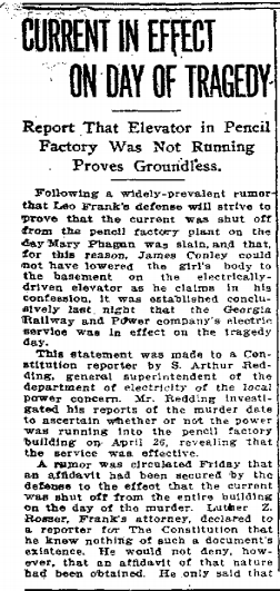 Following a widely-prevalent rumor that Leo Frank's defense will strive to prove that the current was shut off from the pencil factory plant on the day Mary Phagan was slain, and that, for this reason, James Conley could not have lowered the girl's body to the basement on the electrically-driven elevator as he claims in his confession, it was established conclusively last night that the Georgia Railway and Power company's electric service was in effect on the tragedy day.